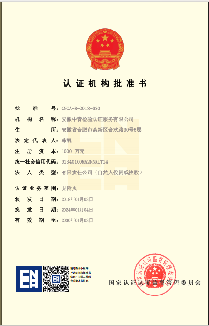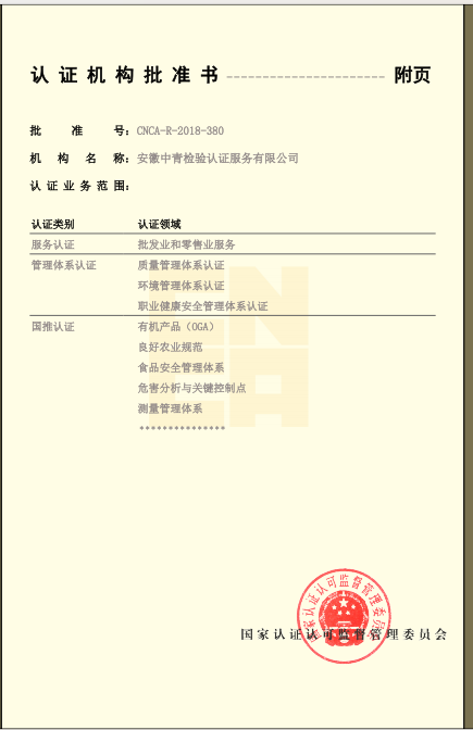 安徽中青檢驗認(rèn)證服務(wù)有限公司成立于2017年6月6日,2018年1月3日通過國家認(rèn)證認(rèn)可監(jiān)督管理委員會批準(zhǔn),現(xiàn)認(rèn)證領(lǐng)域:質(zhì)量管理體系、環(huán)境管理體系、職業(yè)健康安全管理體系、食品安全管理體系、HACCP管理體系、有機(jī)產(chǎn)品認(rèn)證、良好農(nóng)業(yè)規(guī)范、服務(wù)體系、醫(yī)療器械質(zhì)量管理體系、企業(yè)誠信管理體系、食品工業(yè)企業(yè)誠信管理體系、食安安徽品牌等類別認(rèn)證。